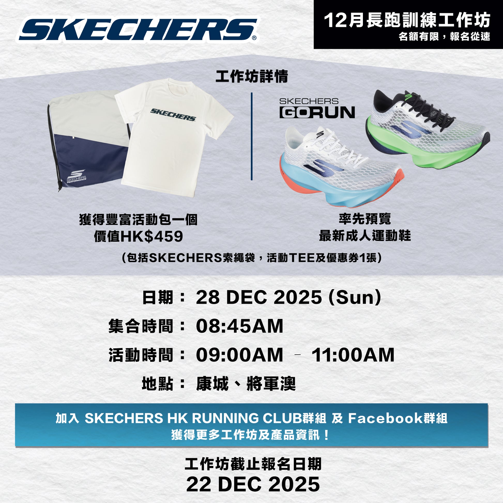 點擊此處加入 Skechers HK Running Club Facebook 群組,了解更多關於跑步工作坊及活動的最新消息!